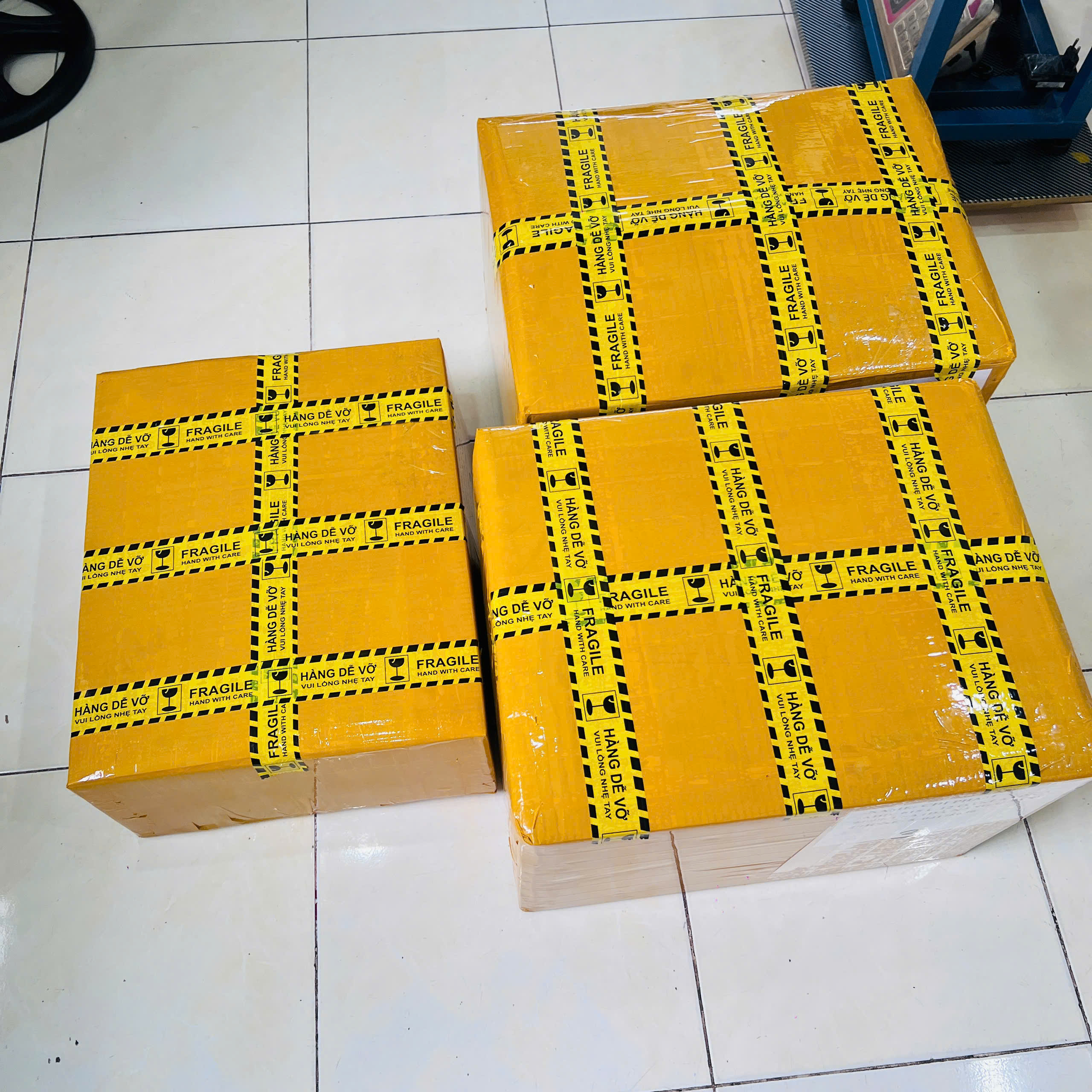Dán băng keo theo hình chữ H (dọc và ngang mép thùng). Dán tem 'Hàng dễ vỡ' hoặc 'Chiều đứng' nếu cần thiết.